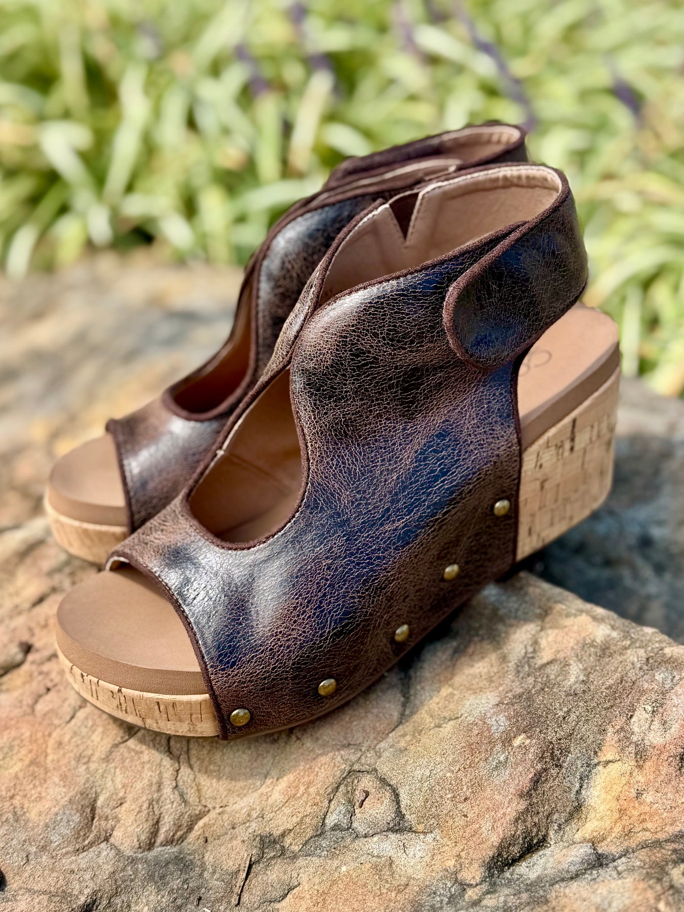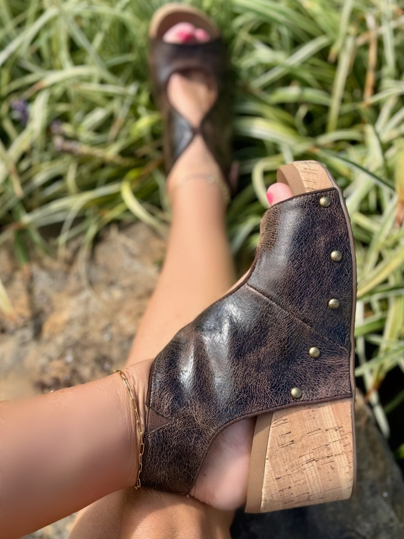 The Corkys "Frisky" in Espresso Crinkle offers a comfortable 2.5-inch heel paired with a 0.75-inch platform, providing elegant lift without compromising stability. Its rich espresso crinkle finish adds a textured, sophisticated look, ideal for elevating both casual and dressy outfits with expert-crafted comfort.