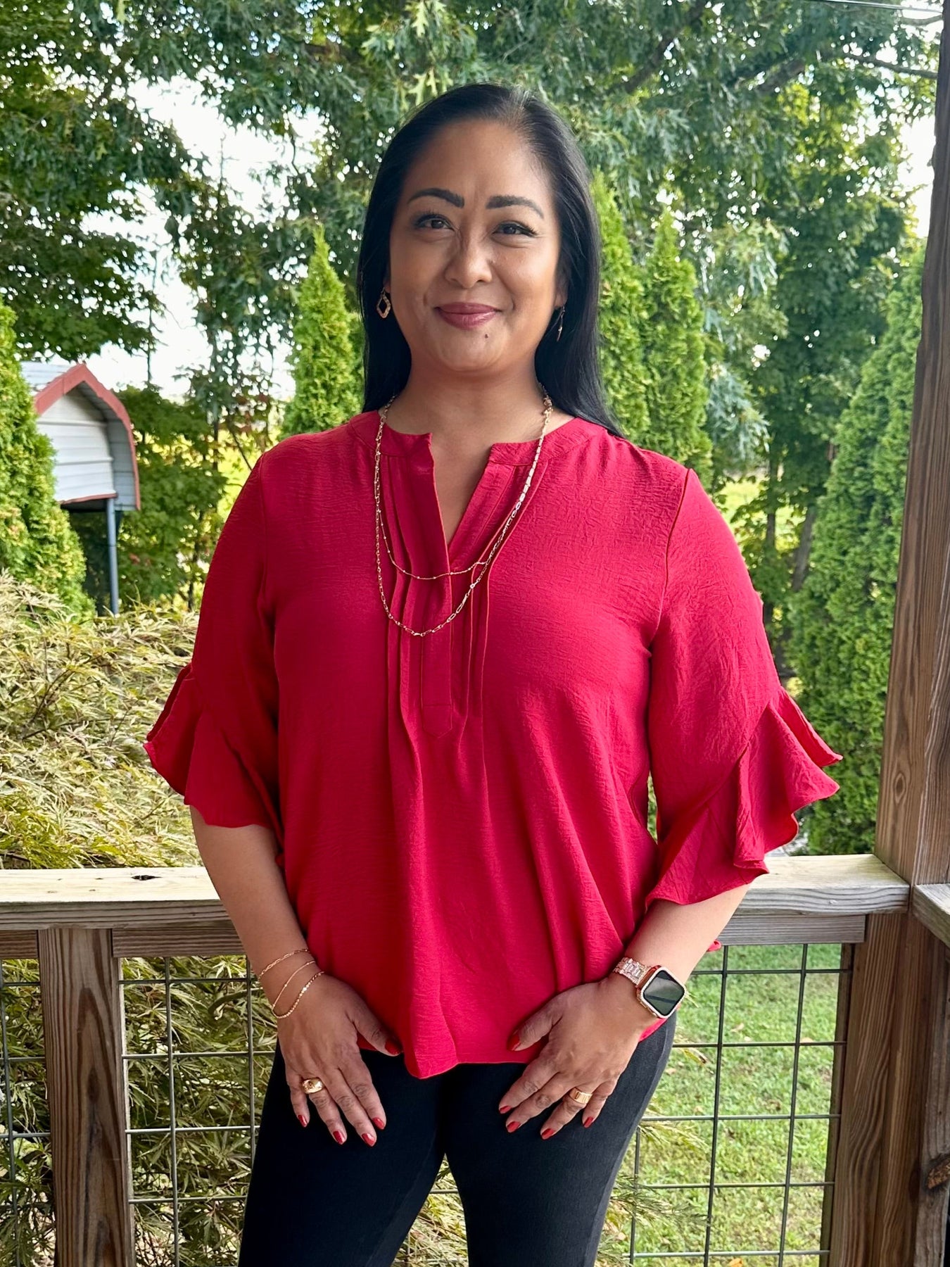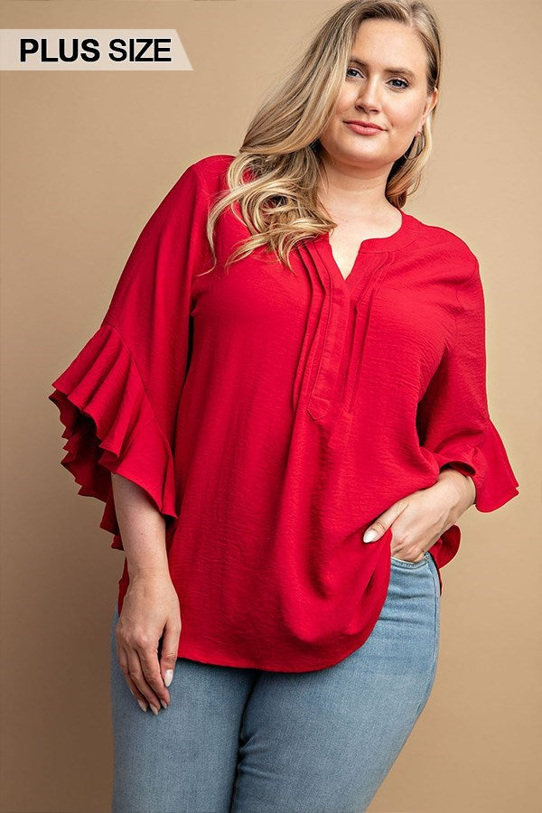 Curvy Red Ruffled Bell Sleeve and Front Pleated Detail Top