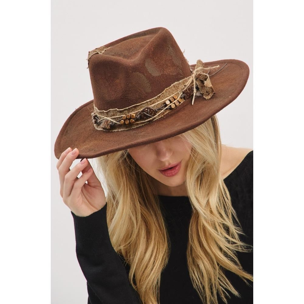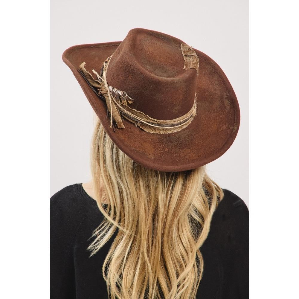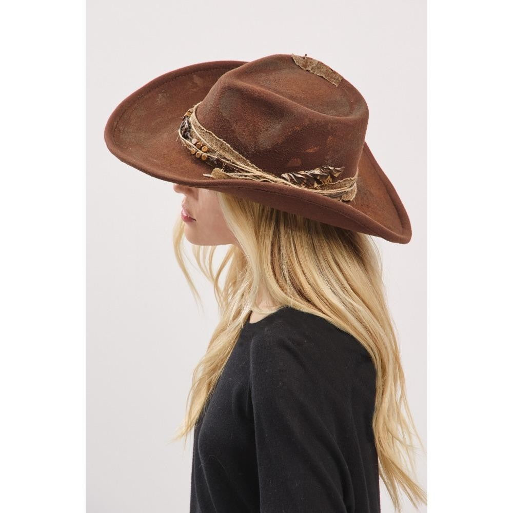 Dk Camel Rustic Cowgirl & Fedora Hat With Feather & Distressed Fabric Band
