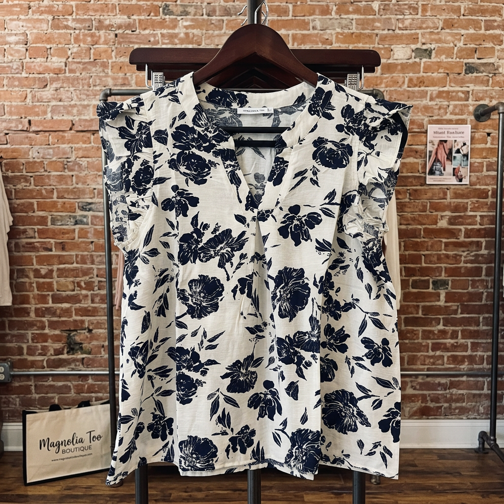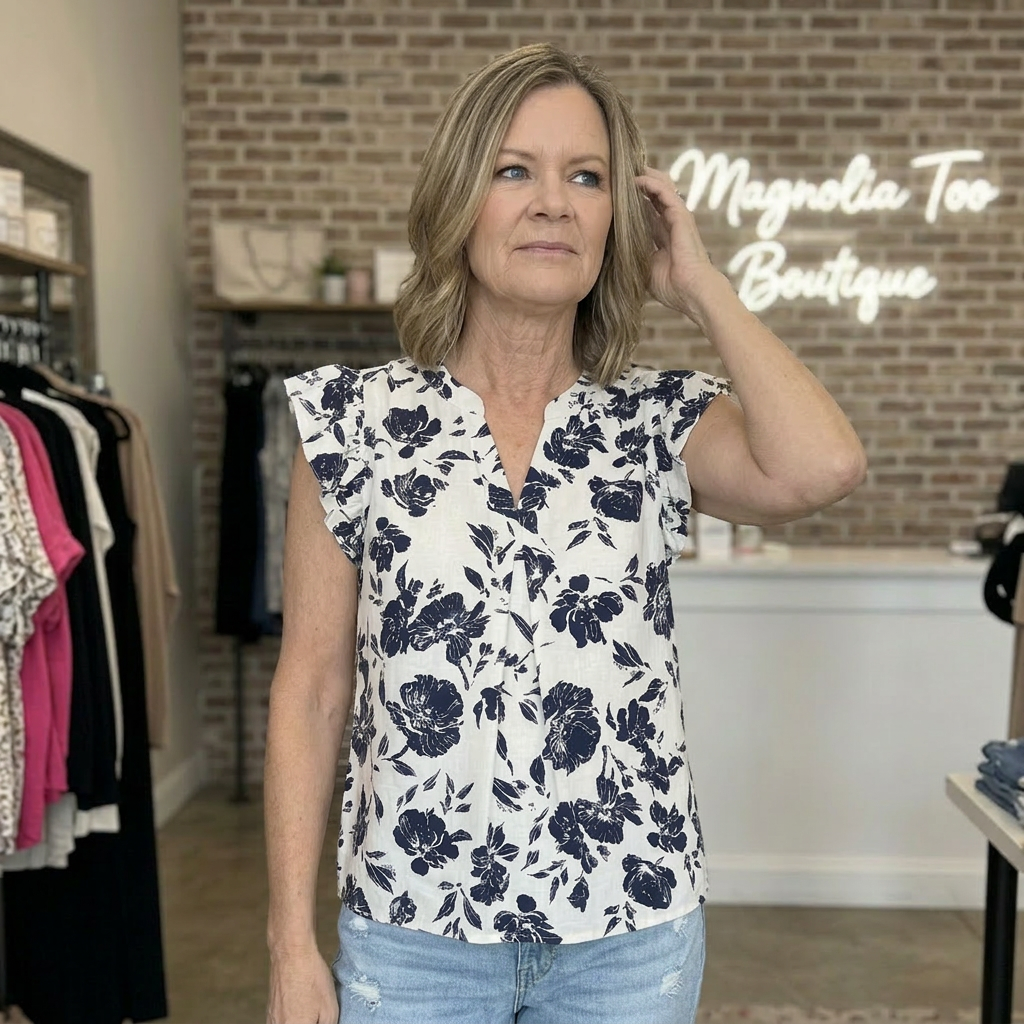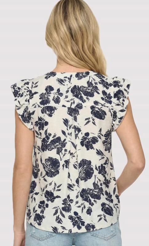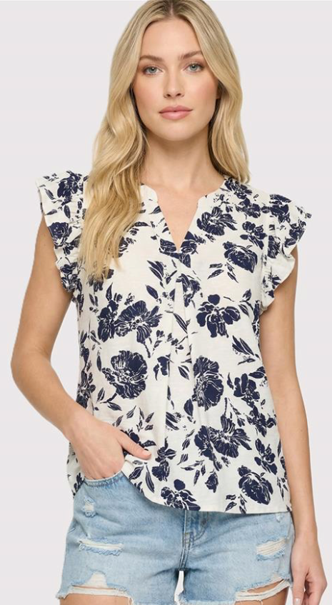 Navy V-Neck Ruffle Sleeve Top