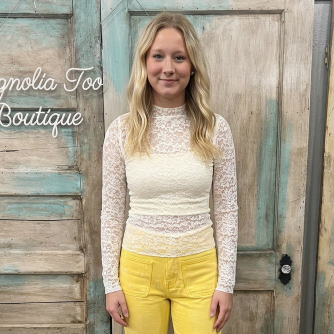 Elevate your wardrobe with this sophisticated ivory long sleeve top. The high neckline and fitted silhouette create a flattering, modern look, while delicate sheer mesh and lace knit details add an elegant touch of texture. Perfect for layering or wearing solo, this versatile piece transitions seamlessly from day to evening. The refined design makes it an essential addition to any closet.