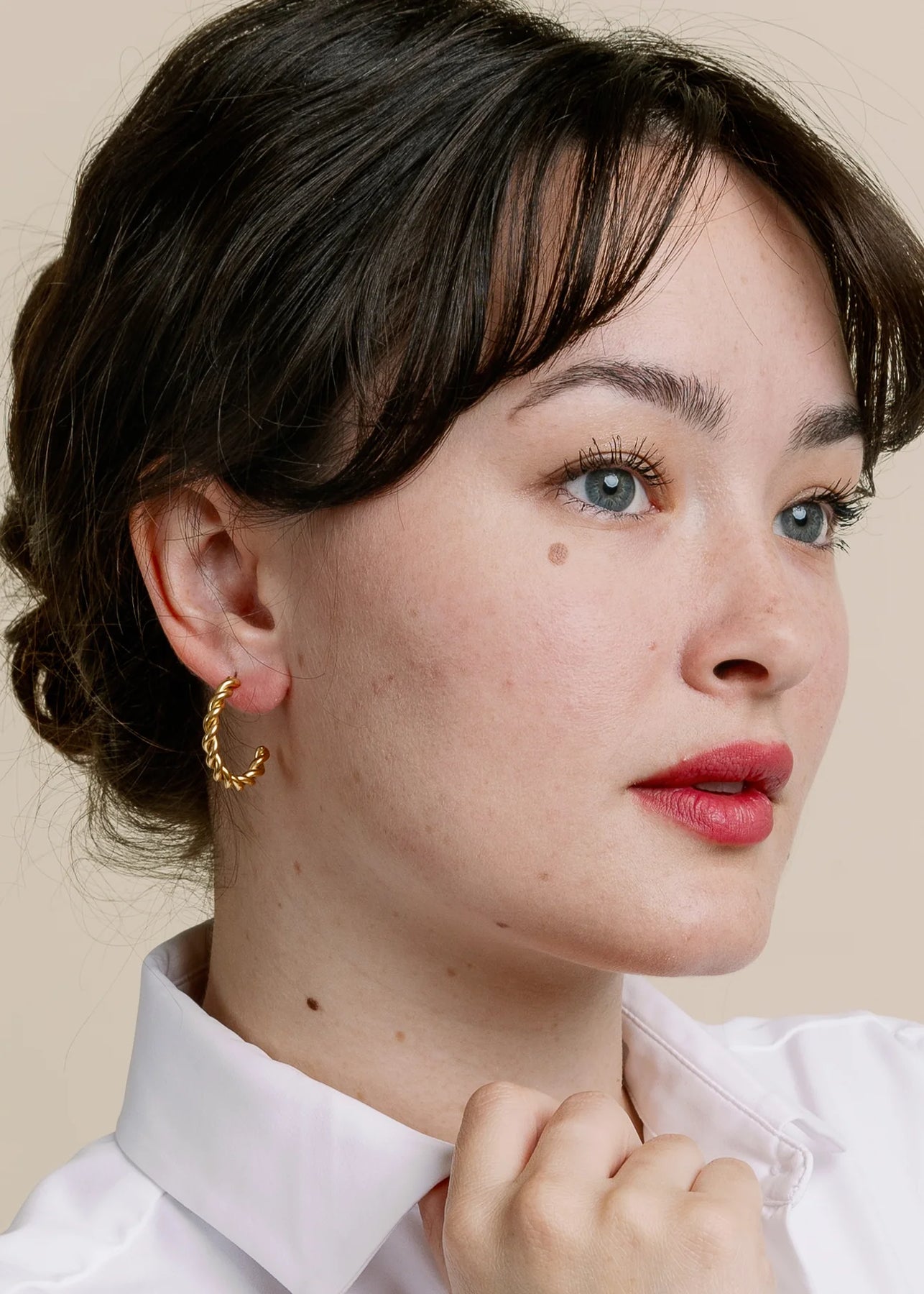 Introducing the Jayde Hoops - Small. A "twist" on traditional gold hoops. These small hoops add a unique touch to any outfit! Also available in Medium and Large versions.