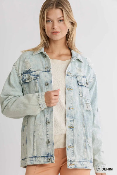 Light Acid Washed Distressed Denim Jacket with Pockets