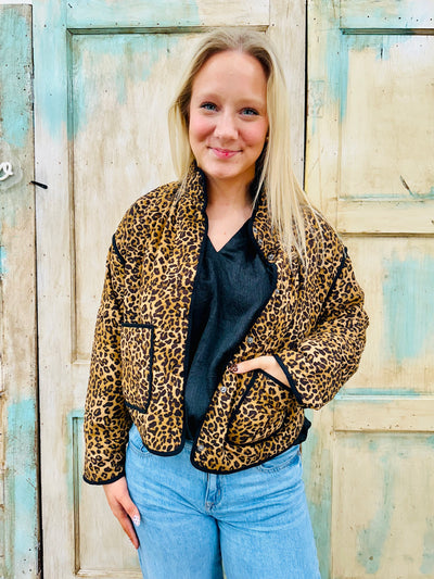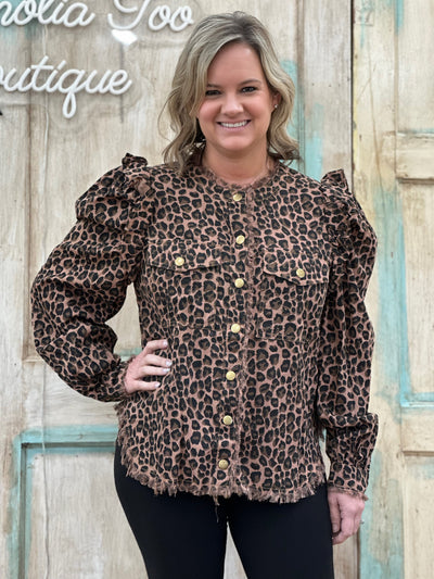 Leopard Collarless Lightweight Jacket w/ Ruffled Shoulders