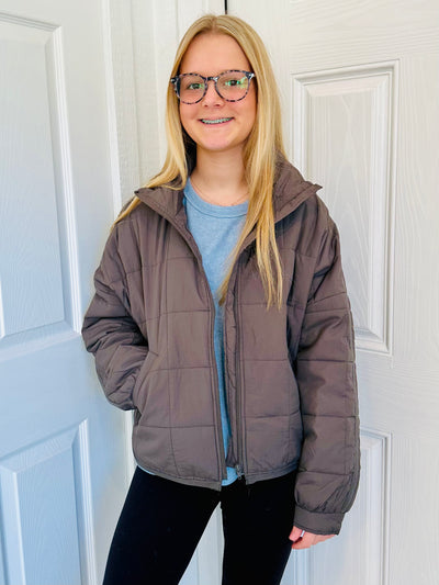 SC CHARCOAL QUILTED SQUARE ZIP-UP PUFFER JACKET