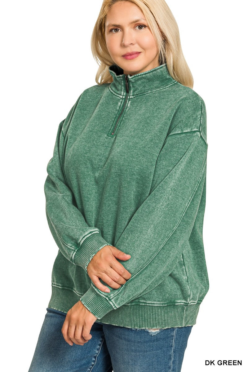 Dark Green Plus Acid Wash Fleece Half Zip Pullover