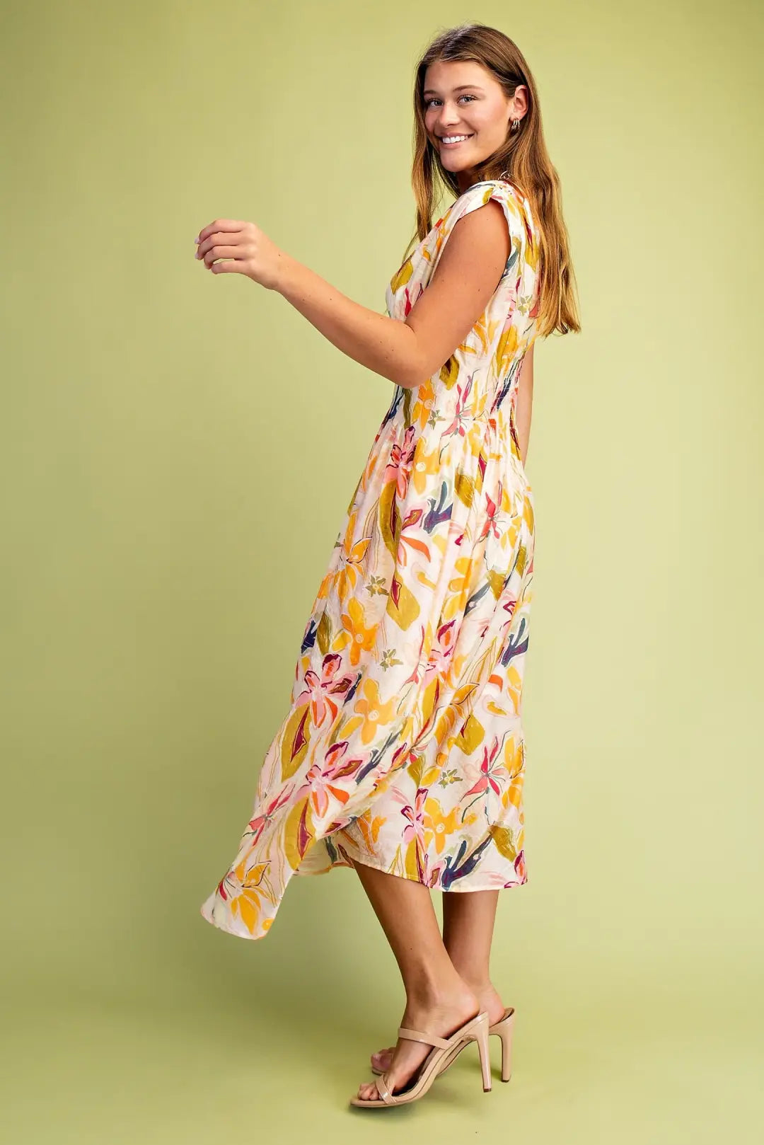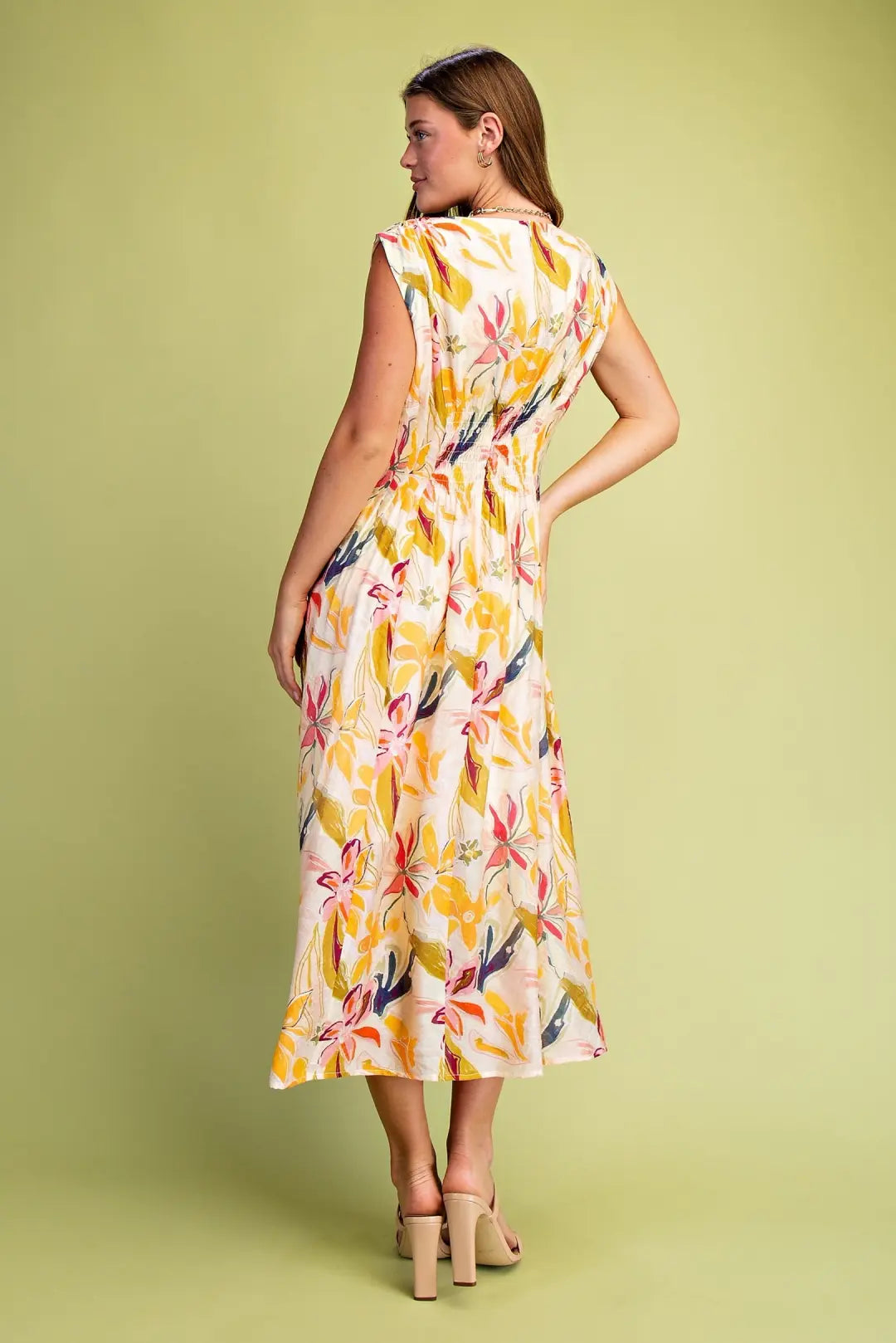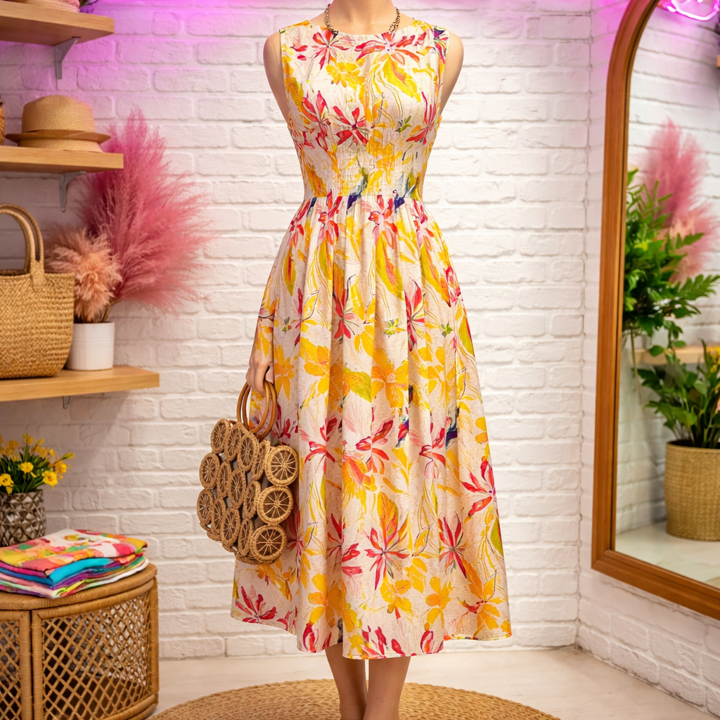 Elevate your wardrobe with this sophisticated floral print midi dress, designed for refined elegance. The cap sleeves offer a flattering silhouette while the pintucked waist creates subtle definition. Functional pockets provide practical style, and delicate smocking details on the back add visual interest. Crafted from a luxurious rayon and nylon blend, the fully lined construction ensures comfort and durability. Perfect for transitional seasons and versatile enough for both casual outings and polished occasions.
