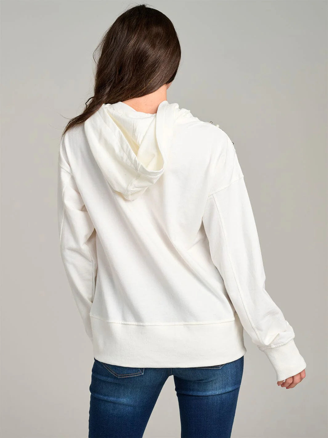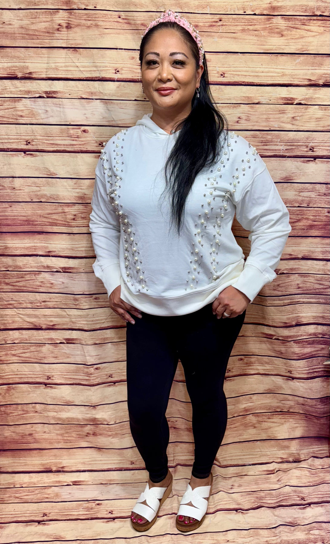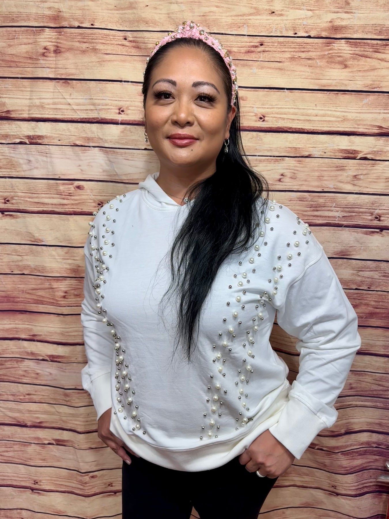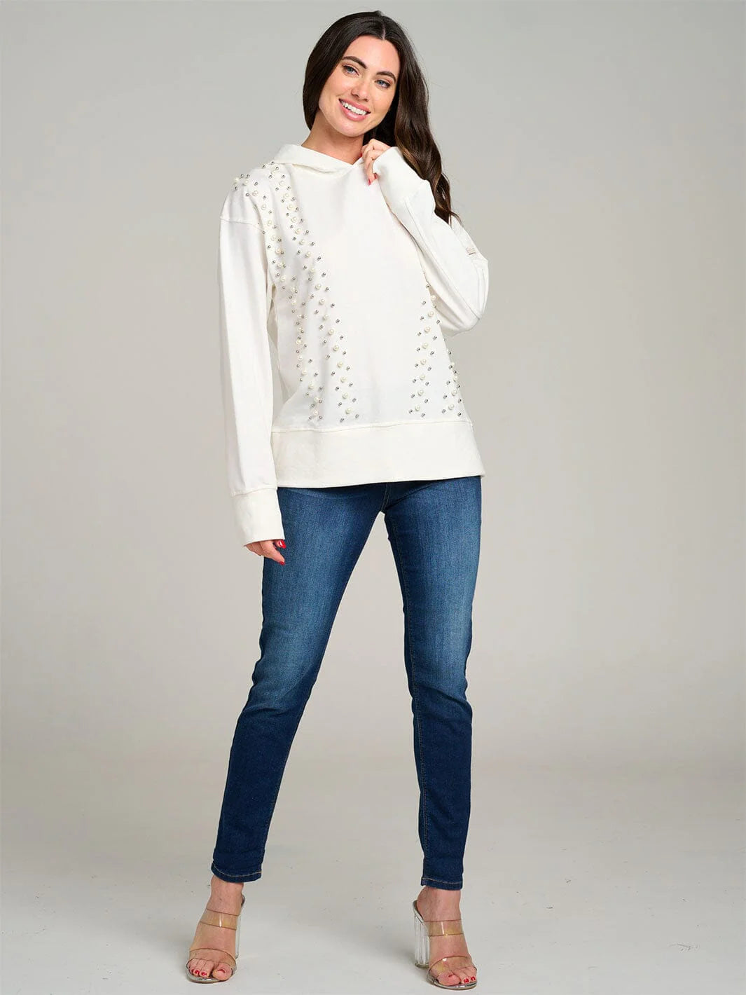 IVORY LONG SLEEVE PEARL DETAILED HOODED PULLOVER SWEATER