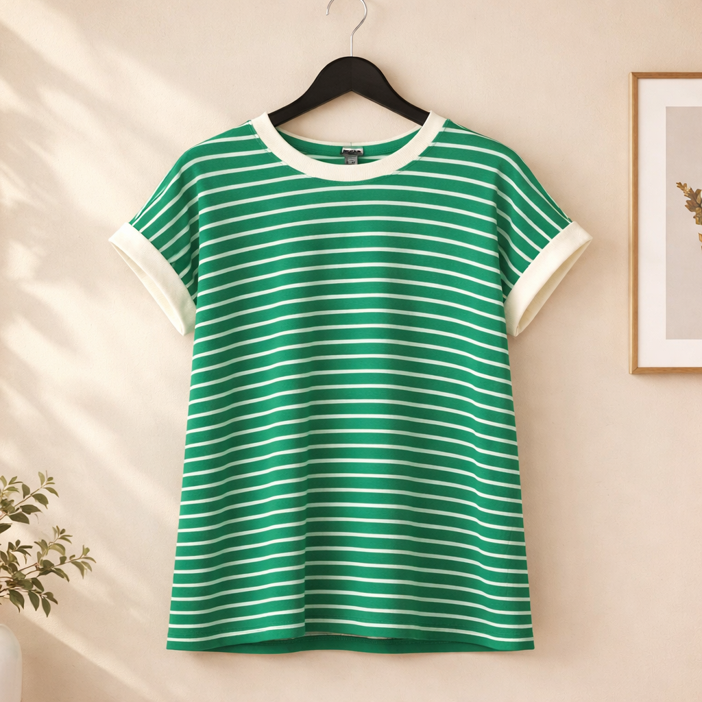 Elevate your casual wardrobe with this versatile striped tee, expertly crafted from a premium cotton-spandex blend that delivers both comfort and durability. The 95% cotton composition ensures breathability and softness against your skin, while the 5% spandex provides gentle stretch and recovery for all-day wear. Designed with flattering cap sleeves and contrast trim detailing, this piece offers a polished silhouette that works seamlessly from weekend errands to relaxed social gatherings. The classic stripe pattern adds visual interest without overwhelming your styling options, making it an essential layering piece or standalone favorite for any season.