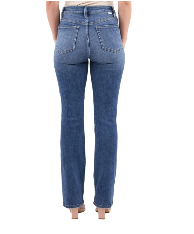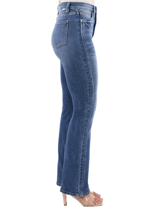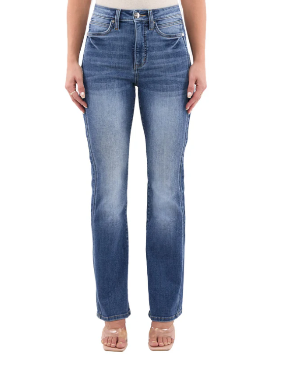Mia High Rise Bootcut Slimmers Jeans, designed to enhance your curves with a slimming effect. The high-rise waist cinches comfortably, while the bootcut leg creates a balanced, flattering shape. Featuring a 1-button closure and durable zipper, these jeans provide a secure, all-day fit.