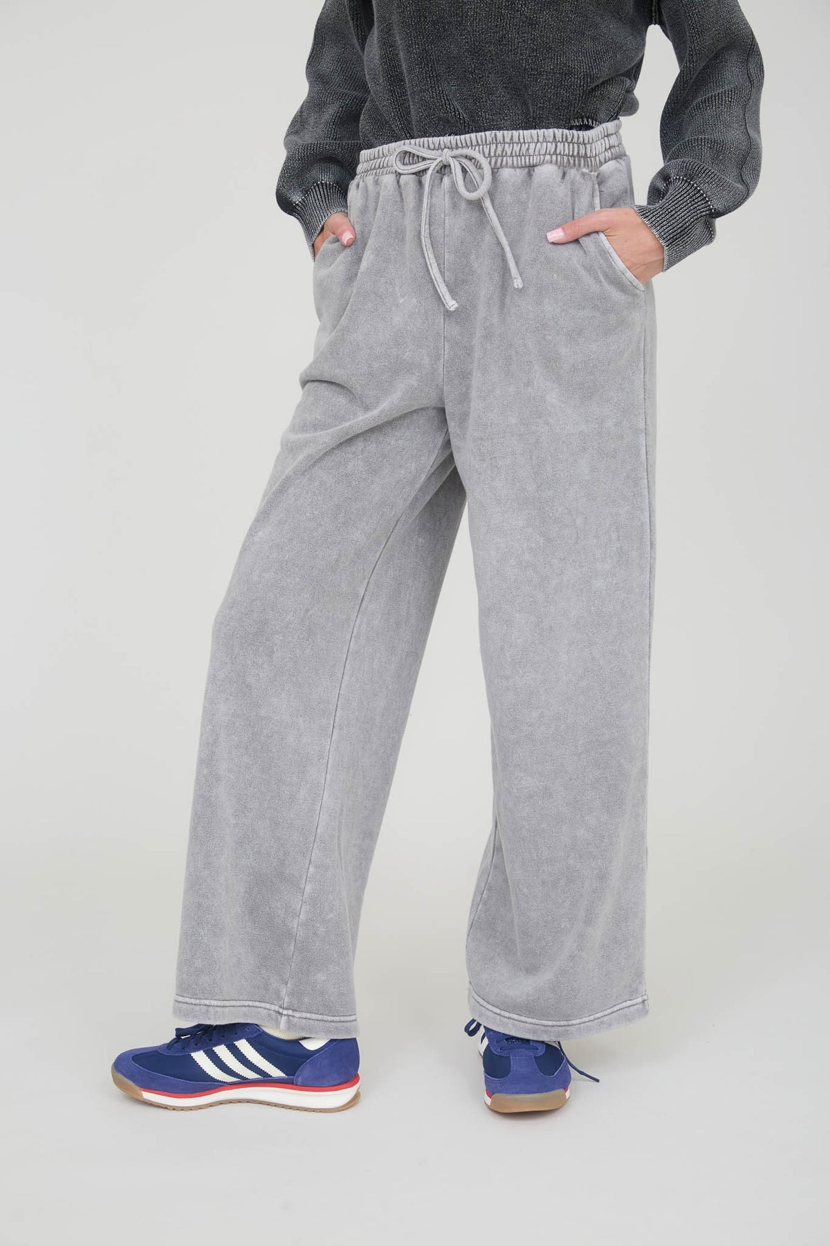 These washed wide leg lounge pants combine comfort and style with their high waist and elasticized drawstring for a customizable fit. Crafted from a soft blend of 85% cotton and 15% polyester, they offer durability and breathability, while the 100% cotton pocket lining adds softness where it counts. Featuring spacious pockets and a relaxed wide leg cut, these pants are ideal for lounging or casual wear. The acid-washed pattern ensures a unique, vintage-inspired look with natural tonal variations.